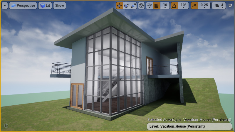 This house is my first attempt at a web based virtual walkthrough. The house is an extremely simple house constructed from a lesson plan for Revit. It was then exported from Revit using the Datasmith plug-in and then imported into Unreal Engine.